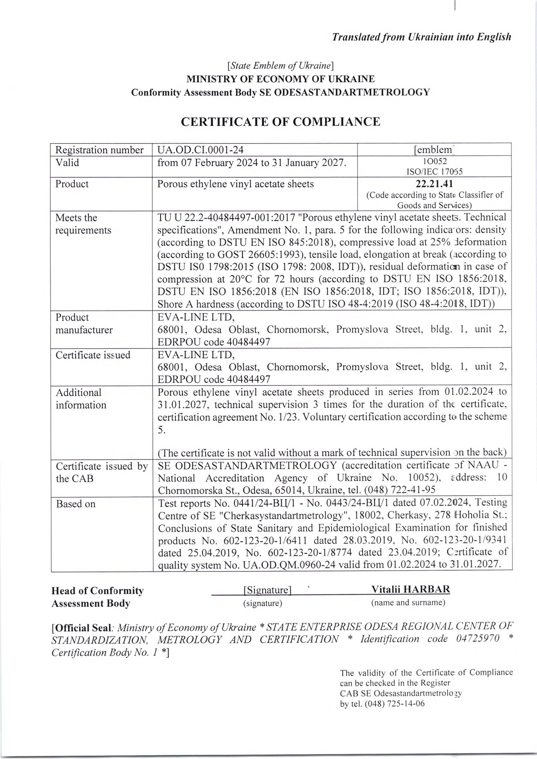 ZERTIFIKAT DER ÜBEREINSTIMMUNG, ausgestellt vom Ministerium für Wirtschaft der Ukraine und dem Konformitätsbewertungsorgan SE ODESASTANDARTMETROLOGY, bestätigt, dass ein Produkt oder eine Dienstleistung den geltenden ukrainischen Standards und Vorschriften entspricht. Dieses Zertifikat stellt sicher, dass das Produkt oder die Dienstleistung die erforderlichen gesetzlichen oder branchenüblichen Kriterien erfüllt.